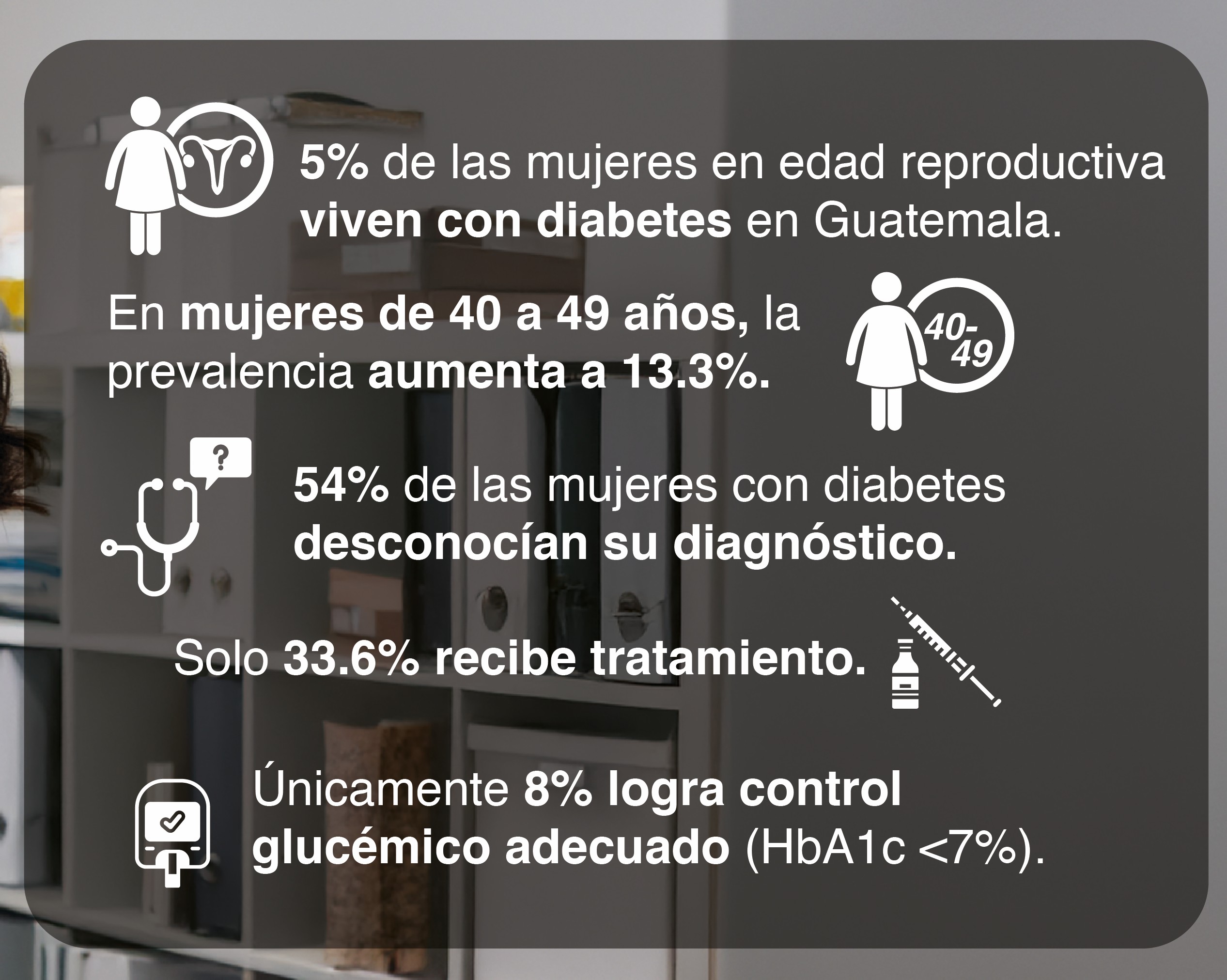 - 5% de las mujeres en edad reproductiva viven con diabetes en Guatemala.